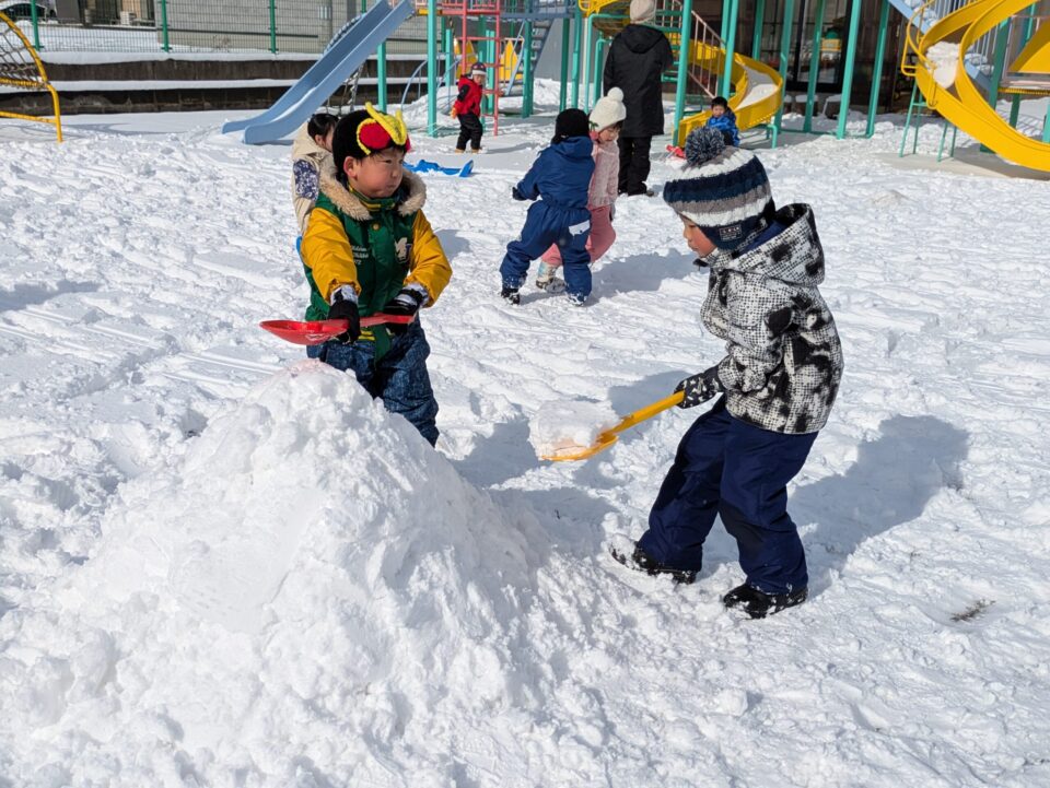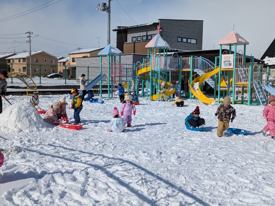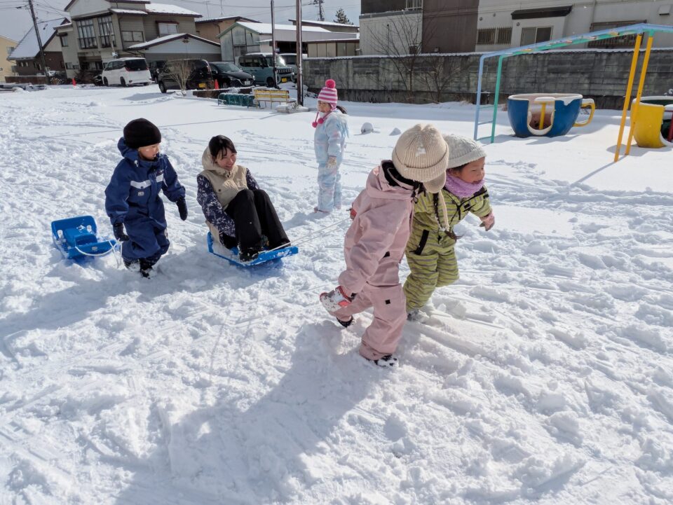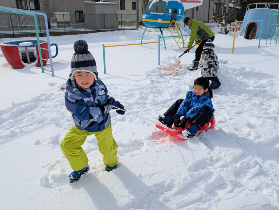 園庭に出ると、ソリに友達や先生を乗せて引っ張ったり、雪を丸めて友達にあてたり、かまくら作りをしたりと、雪ならではの遊びを楽しんでいました。